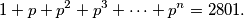Odredi sve uređene parove $(p,n)$, pri čemu je $p$ prost, a $n$ prirodan broj za koje vrijedi \[ 1+p+p^{2}+p^{3}+ \dotsb +p^{n}=2801. \]