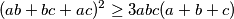 Neka su $a, b, c$ pozitivni realni brojevi. Dokaži da vrijedi: $$(ab+bc+ac)^2 \geq 3abc(a+b+c)$$