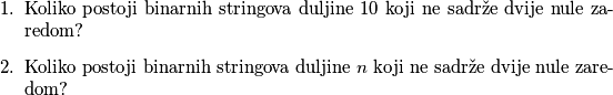 \item Koliko postoji binarnih stringova duljine $n$ koji ne sadrže dvije nule zaredom?