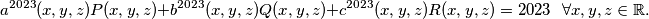 Kažemo da je trojka a, b, c polinoma u tri varijable Mislavova ukoliko postoji trojka polinoma u tri varijable P, Q, R tako da vrijedi: a^{2023}(x, y,z)P(x, y,z) + b^{2023}(x, y,z)Q(x, y,z) + c^{2023}(x, y,z)R(x, y,z) = 2023 \ \ \ \forall x,y,z \in \mathbb{R}.