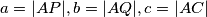 Neka su $a=|AP|, b=|AQ|, c=|AC|$. Odredite duljinu stranice $|AB|$ u ovisnosti o $a, b, c$.