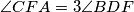 Neka su $E$ i $F$ točke na stranici $AB$ u $\triangle ABC$ tako da vrijedi $AE=EF=FB$. $D$ je tocka na pravcu $BC$ i vrijedi $ED \perp BC$. Pretpostavimo da vrijedi $AD \perp CF$ i $\angle CFA=3 \angle BDF$. Pronađi omjer $\frac{DB}{DC}$.