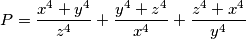 Neka su $x,y,z > 0$ i pretpostavimo da vrijedi $$x^{2}+y^{2}-2z^{2}+2xy+yz+zx\leq0$$ Nađi minimum izraza $$P=\frac{x^{4}+y^{4}}{z^{4}}+\frac{y^{4}+z^{4}}{x^{4}}+\frac{z^{4}+x^{4}}{y^{4}}$$ Rezultat zaokruži na tri decimale