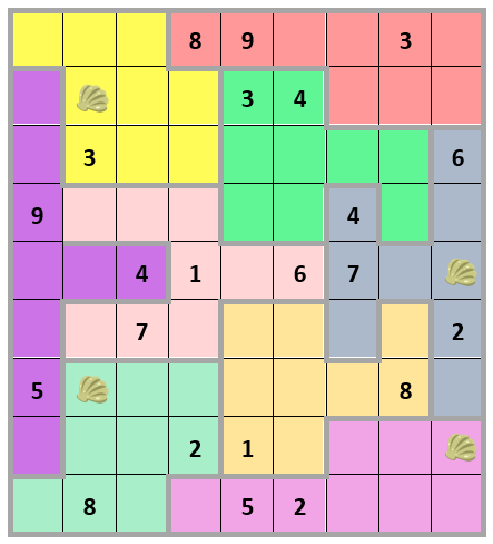 Riješite sudoku sa slike! U svako polje upišite jedan od prirodnih brojeva od 1 do 9, i to tako da se u svakom retku, svakom stupcu te u svakoj obojanoj ćeliji (sada u raznim oblicima) svaki od njih nalazi točno jednom.