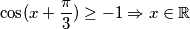 $$ \cos(x+\frac{\pi}{3}) \geq -1 \Rightarrow x\in\mathbb{R}$$
