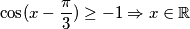 $$ \cos(x-\frac{\pi}{3}) \geq -1 \Rightarrow x\in\mathbb{R}$$