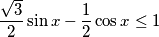 $$\frac{\sqrt{3}}{2}\sin x - \frac{1}{2}\cos x \leq 1$$
