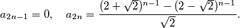 Let $A$ and $E$ be opposite vertices of an octagon. A frog starts at vertex $A.$ From any vertex except $E$ it jumps to one of the two adjacent vertices. When it reaches $E$ it stops. Let $a_n$ be the number of distinct paths of exactly $n$ jumps ending at $E$. Prove that: $$a_{2n-1}=0, \quad a_{2n}={(2+\sqrt2)^{n-1} - (2-\sqrt2)^{n-1} \over\sqrt2}.$$