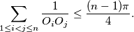 Let $n\geq3$ be a positive integer. Let $C_1,C_2,C_3,\ldots,C_n$ be unit circles in the plane, with centres $O_1,O_2,O_3,\ldots,O_n$ respectively. If no line meets more than two of the circles, prove that $$\sum\limits^{}_{1\leq i<j\leq n}{1\over O_iO_j}\leq{(n-1)\pi\over 4}.$$