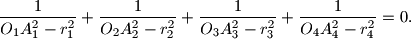 $$\frac{1}{O_1A_1^2-r_1^2}+\frac{1}{O_2A_2^2-r_2^2}+\frac{1}{O_3A_3^2-r_3^2}+\frac{1}{O_4A_4^2-r_4^2}=0.$$
