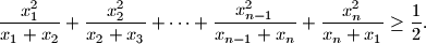 $$\frac{x_1^2}{x_1+x_2} + \frac{x_2^2}{x_2+x_3} + \cdots + \frac{x_{n-1}^2}{x_{n-1}+x_n} + \frac{x_n^2}{x_n+x_1} \geq \frac{1}{2}.$$