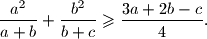 %V0 Neka su $a$, $b$ i $c$ pozitivni realni brojevi. Dokaži da vrijedi $$\frac{a^2}{a+b}+\frac{b^2}{b+c}\geqslant \frac{3a+2b-c}{4}.$$