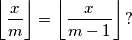 Neka je $m \geqslant 2$ prirodan broj. Koliko rješenja u skupu prirodnih brojeva ima jednadžba $$\left\lfloor{\vphantom{\frac{x}{m-1}}\frac{x}{m}}\right\rfloor = \left\lfloor{\frac{x}{m-1}}\right\rfloor \text{?}$$