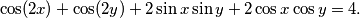 Riješi jednadžbu \[ \cos(2x) + \cos(2y) + 2\sin x\sin y + 2\cos x\cos y = 4. \]
