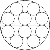 Deset kružnica polumjera $r=1$ postavljeno je unutar kružnice polumjera $R$ kao na slici. Koliki je $R$?