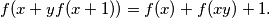 Odredi sve funkcije $f: \mathbb R \to \mathbb R$ takve da za sve realne brojeve $x,y$ vrijedi $$f(x+yf(x+1))=f(x)+f(xy)+1\text.$$