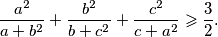 Dokaži da za pozitivne realne brojeve $a$, $b$ i $c$ za koje je $a + b + c = 3$ vrijedi $$\frac{a^2}{a+b^2} + \frac{b^2}{b+c^2} + \frac{c^2}{c+a^2} \geqslant \frac{3}{2} \text{.}$$