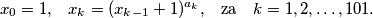 \[ x_0 = 1\text{,}\quad x_k = (x_{k-1} + 1)^{a_k}\text{,}\quad\text{za}\quad k = 1, 2, \dotsc, 101. \]