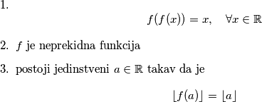 \item postoji jedinstveni $a\in\mathbb{R}$ takav da je $$\lfloor f(a) \rfloor=\lfloor a \rfloor$$